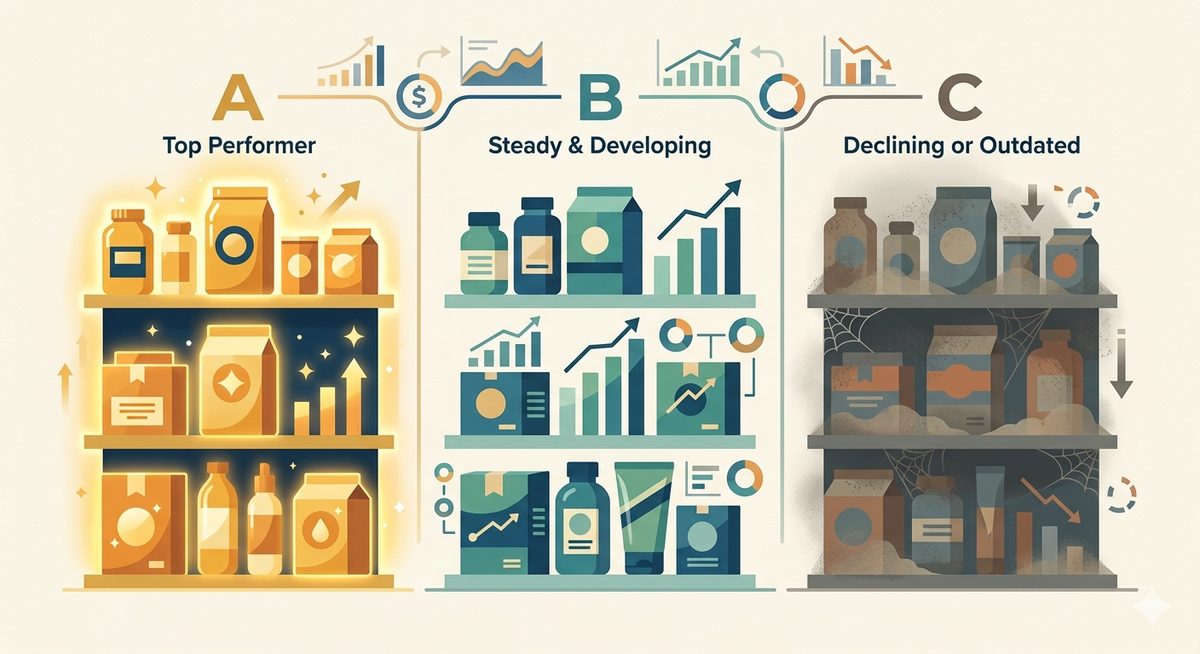 ABC-анализ отвечает на эти вопросы. Он делит весь ассортимент на три группы по принципу Парето (80/20):